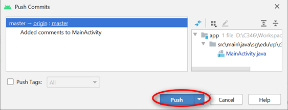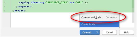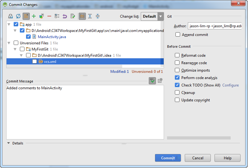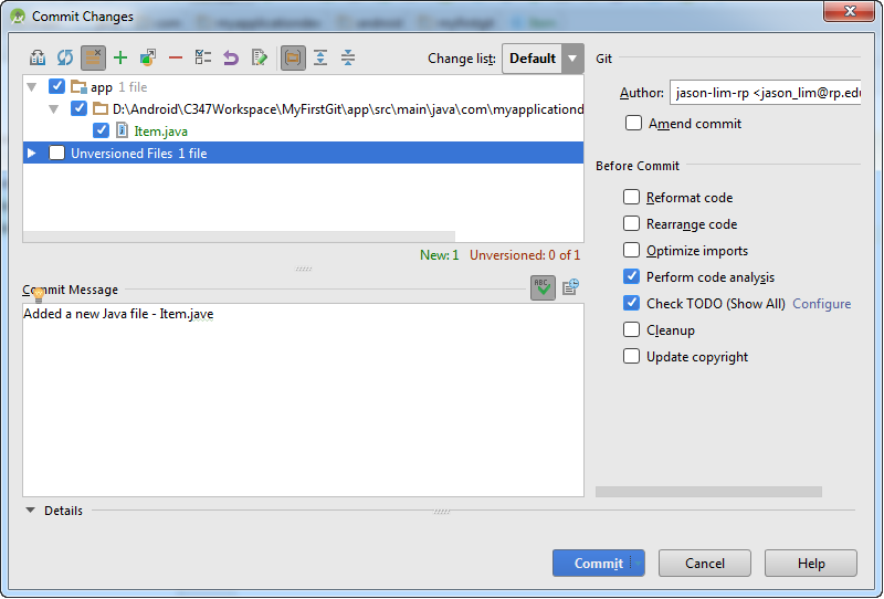 To commit the new file, choose commit changes from the VCS menu. The screen below will appear and do provide the summary for the commit as well.