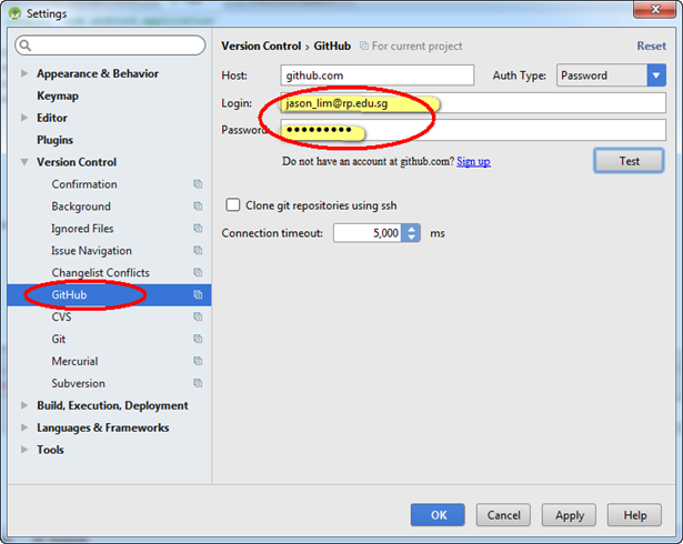 To verify the connectivity to the GitHub, click on the "Test" button to look for this:
