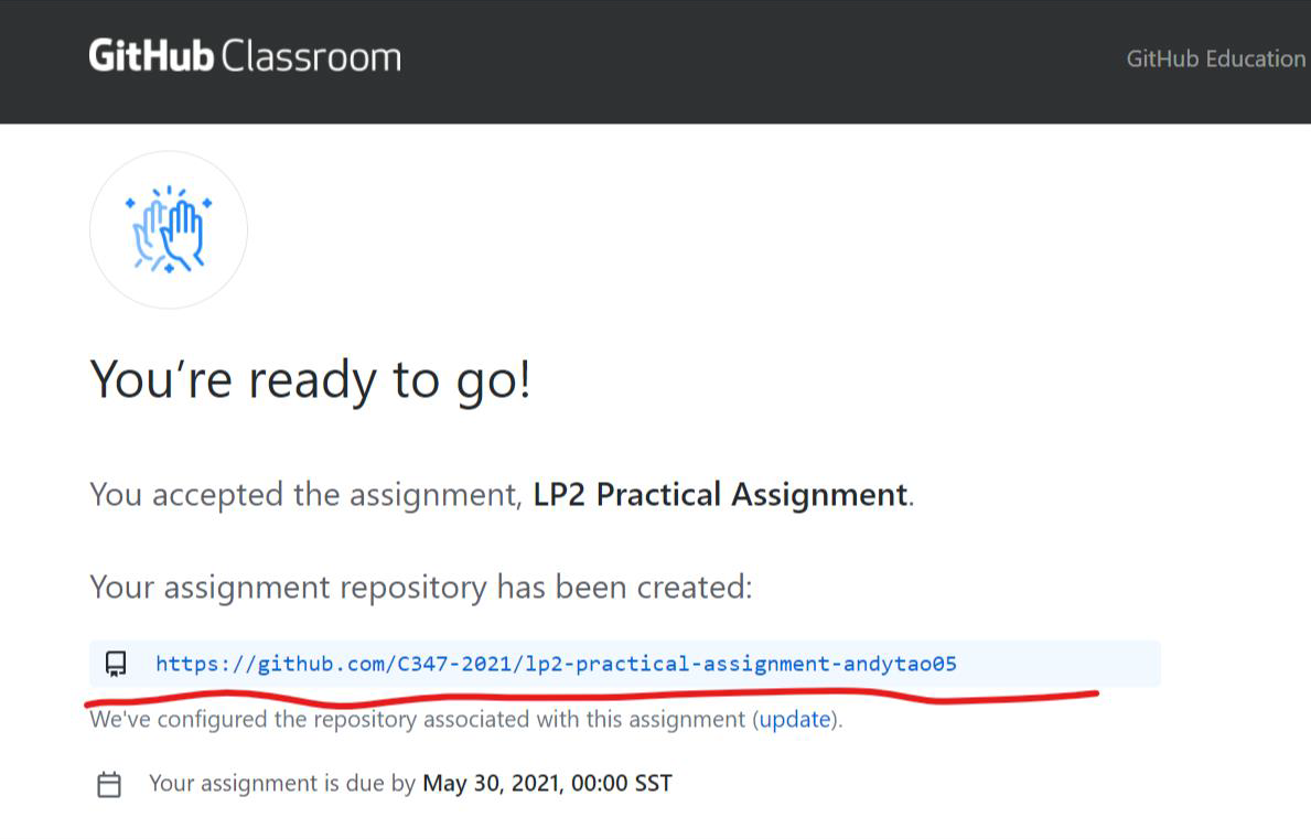 5. Eventually, you'll get to this screen, showing the link to your assigned repository.