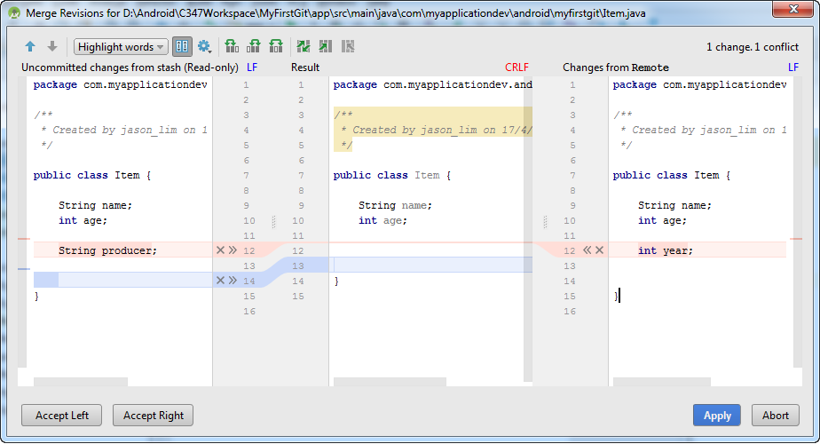 The idea is to look at the changes and to decide whether to keep your copy, other's copy or merge the code.