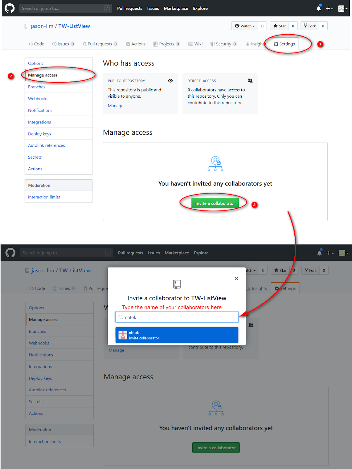 Collaborators must be a GitHub registered member and they could be found by inputting their username.