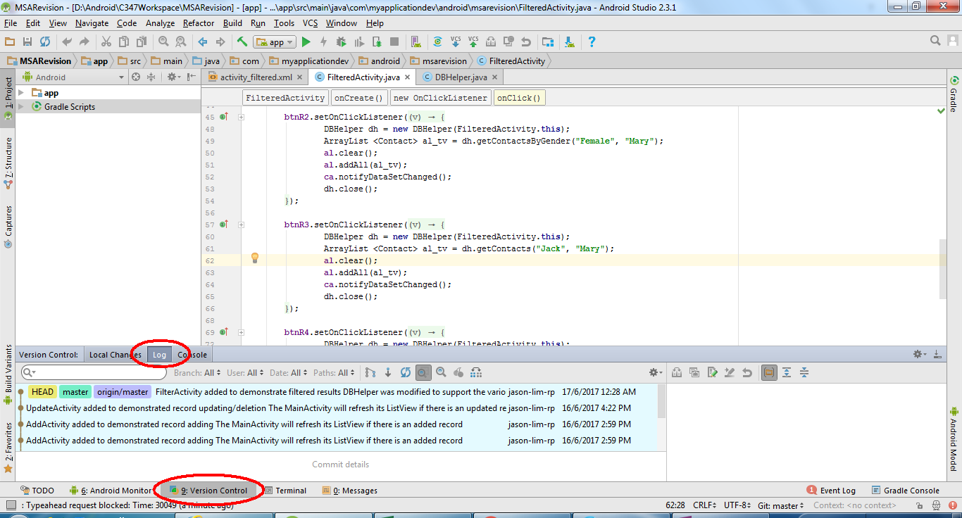 Enable the Version Control view in Android Studio. Alt+9 -> Log