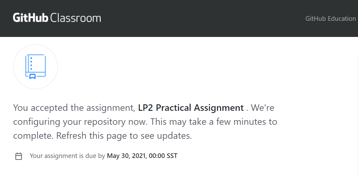 4. You should be seeing that you have accepted the assignment and the process of creating the repository is ongoing now.