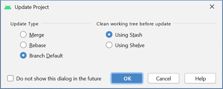 Click OK to proceed. All the files in your Android Studio will be up-to-date. Uncommitted code will be stashed away or merge. De-conflict needs to be done manually.
